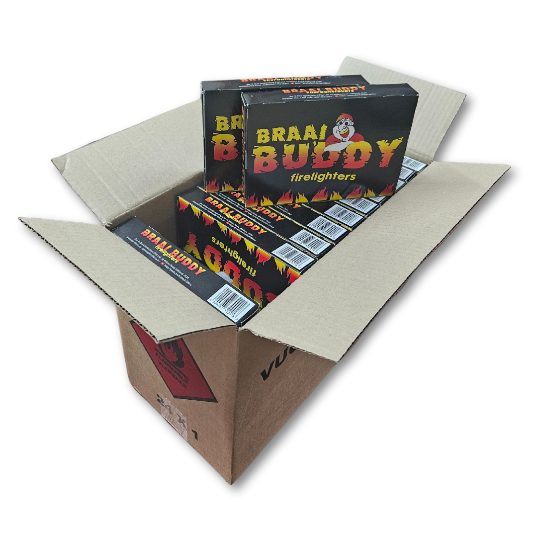 Fuel your fire with a box of 24x BRAAI BUDDY (12-Piece) paraffin-based firelighters, a top choice for smaller businesses specializing in wood or charcoal. Embrace the ambiance at tourist getaways and charming cafes.